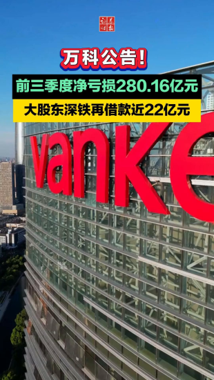 萬科公告!前三季度凈虧損280.16億元,大股東深鐵再借款近22億元